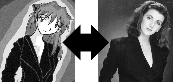 top right is Tiffany, en plug suit with Voice Actor Michael